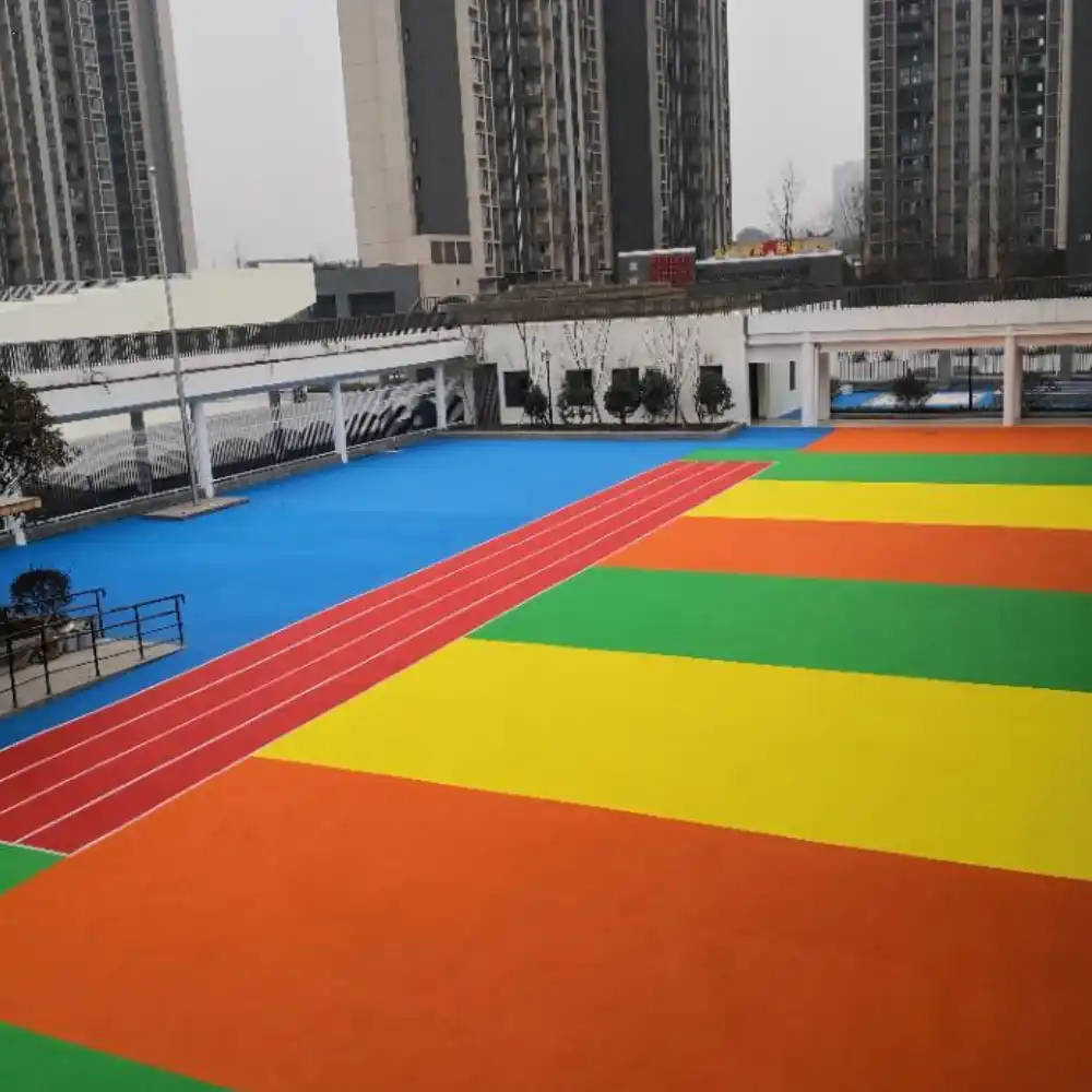 Farbige Oberflächenschicht: EPDM-Partikel in Lebensmittelqualität (Partikelgröße 0,5–3 mm), mit Anti-UV-Wirkstoffen und Anti-Schimmel- und antibakteriellen Inhaltsstoffen, optionale Dicke von 6–25 mm, unterstützt über 20 Standardfarben wie Rot, Blau und Grün sowie benutzerdefinierte Muster.
